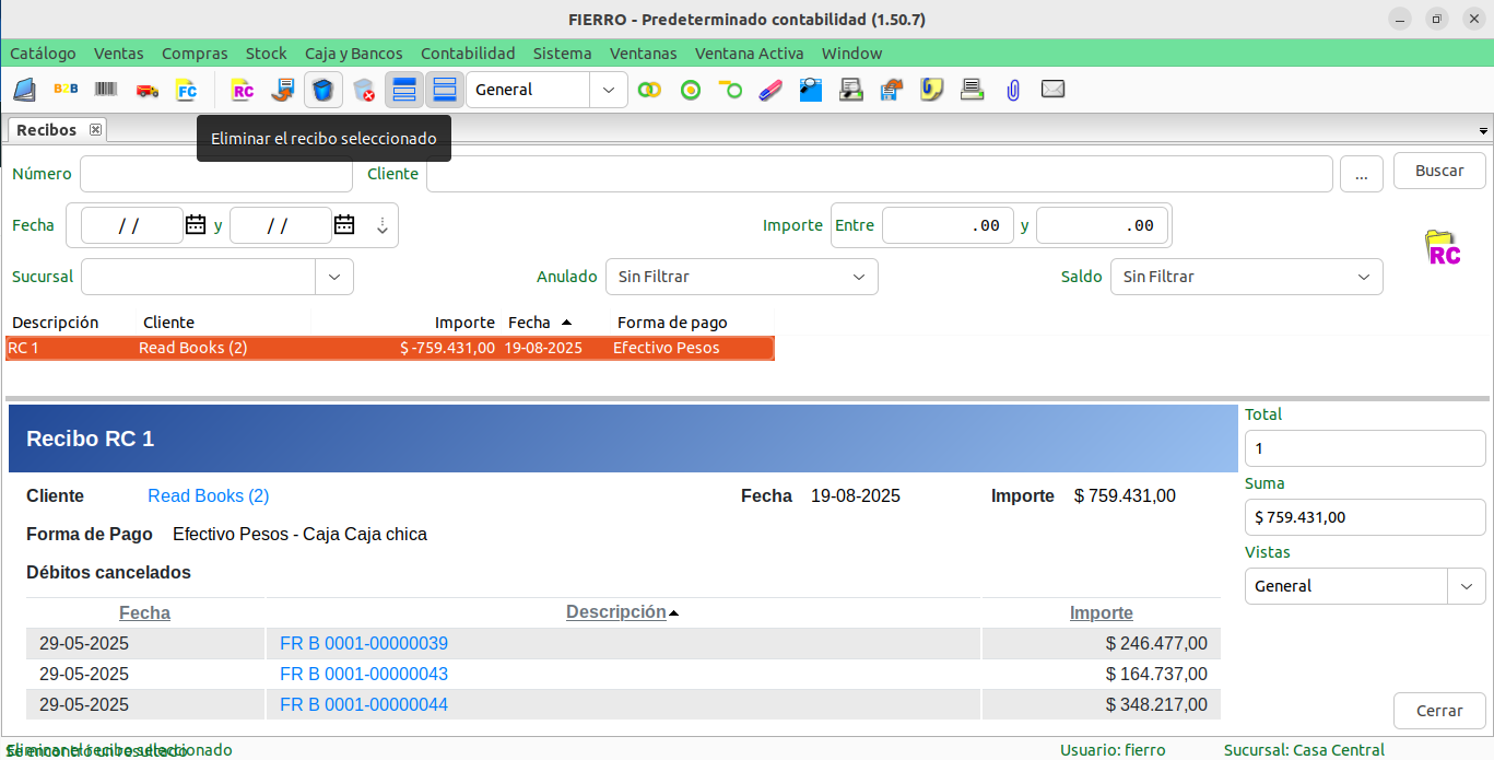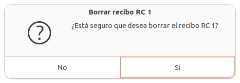 Hacer clic en el botón “Eliminar el recibo seleccionado” ubicado en la barra de herramientas.