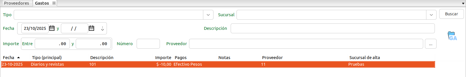 Seleccionar la opción de menú Caja y Bancos ‣ Gastos. Se abrirá la pantalla Búsqueda de gastos. Pantalla Búsqueda de gastos Seleccionar el ícono . Se abrira la pantalla Nuevo Gasto. Pantalla Nuevo gasto Completar los datos del gasto: Proveedor: Si el ...
