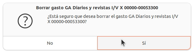 4-Fierro consultará en pantalla si se quiere avanzar con la acción de borrar el/los gasto/s hacer clic en Sí para finalizar el proceso y borrar el/los documentos seleccionados definitivamente.