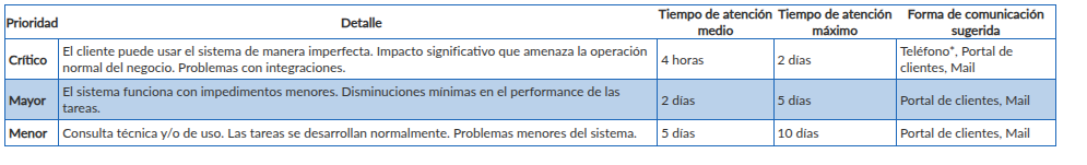 Los tiempos indicados corresponden al tiempo de primera atención de la incidencia y no implican necesariamente su resolución definitiva, la cual puede depender de la complejidad del caso, la información provista por el Cliente y la reproducibilidad del problema.