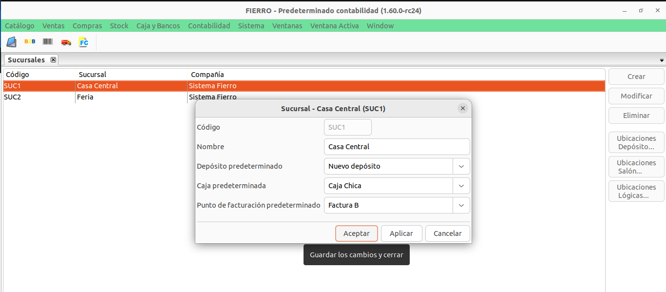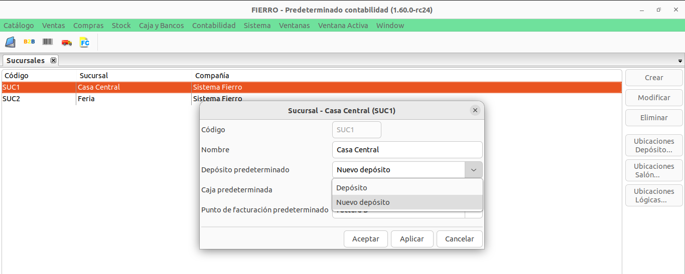 Esta funcionalidad permite definir o modificar el depósito predeterminado asociado a cada sucursal, el cual será utilizado por defecto en los documentos del sistema.