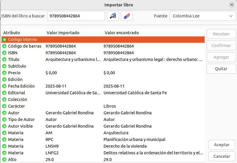 Permite la importación de un libro desde la API de la Cámara del Libro de Colombia, al catálogo de Fierro.
